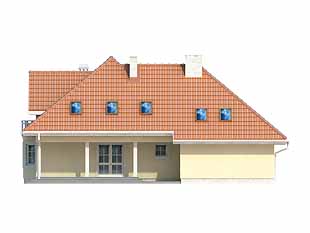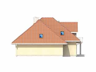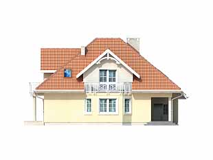 Dom parterowy z poddaszem użytkowym i garażem dwustanowiskowym, niepodpiwniczony dla 4 – 5-osobowej rodziny. Na parterze zaprojektowano dodatkowy pokój – gabinet. Na poddaszu mamy trzy sypialnie, garderobę, dwie łazienki i pomieszczenie rekreacyjne.