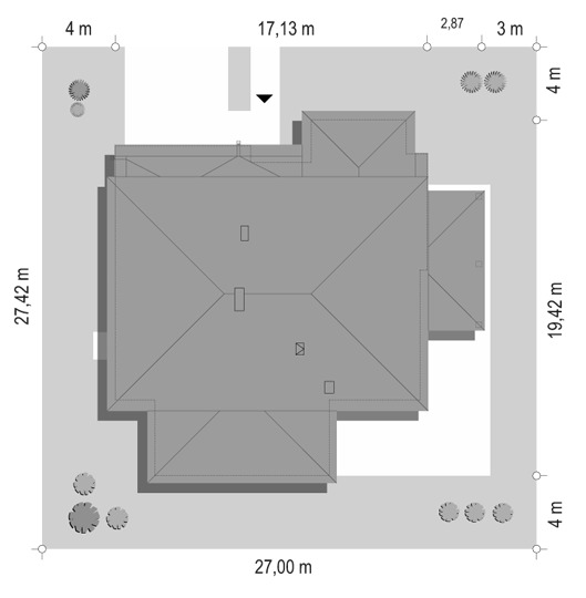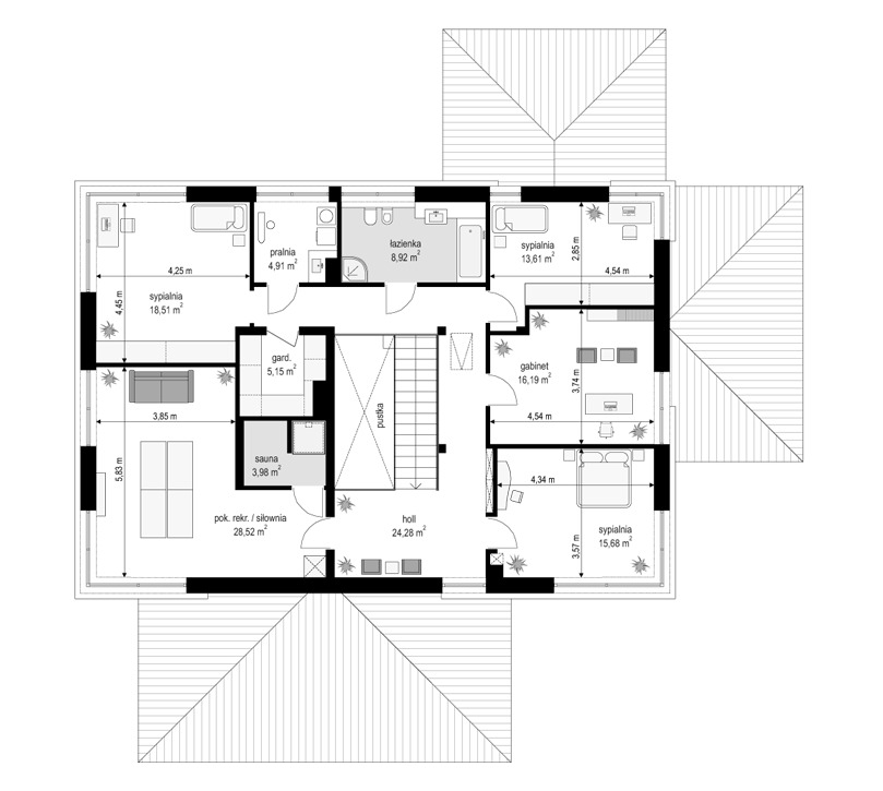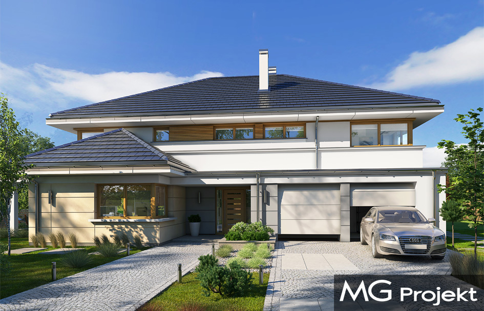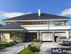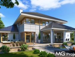Willa komfortowa jest siostrzanym projektem naszego popularnego projektu „Willa z basenem”. Różni się jednak od swojego protoplasty przede wszystkim tym, że nie ma części basenowej. Dom jest wygodną rezydencją dla dwu- lub trzypokoleniowej rodziny. Na piętrze mamy pięć sypialni, a na parterze mamy apartament rodziców, oraz dodatkowe osobne mieszkanko - dla seniorów, lub niani czy też gosposi mieszkającej w domu. Naprawdę wnętrze jest bardzo obszerne i można je na wiele sposobów zagospodarować. Dodatkowe mieszkanie może też być biurem, gabinetem czy przydomową firmą. Architektura domu : budynek jest piętrowy, jego główną bryłę przykrywa czterospadowy dach. Do głównej bryły domu dobudowane są parterowe dobudówki. Elewacje podzielone są na poziome pasy wykończone różnymi materiałami - kamieniem i tynkiem. Okna, przeważnie narożne podkreślają nowoczesny willowy styl. Całość tworzy bardzo atrakcyjną, reprezentacyjną rezydencję miejską. Prawdziwą siedzibę. Do domu wchodzimy przez szerokie drzwi wejściowe z naświetlami, obserwowani z narożnego okna w kuchni do przedsionka i dalej do holu. Hol z reprezentacyjnymi schodami łączy się tutaj z pięknym salonem połączonym z jadalnią. Z salonu przez narożne przeszklenia rozpościera się widok na otaczające tarasy i ogród. Kuchnia jest nieco oddzielona od reszty domu - może być zamknięta przesuwnymi chowanymi drzwiami. Z jadalni przechodzimy do pięknego ogrodowego zadaszonego tarasu. Z drugiej strony domu mamy część garażowo-gospodarczą z podwójnym garażem i kotłownią, dodatkowy lokal – mieszkanie, oraz apartament rodziców z łazienką i podwójną garderoba. Na piętrze przewidziano aż pięć pokoi, dwie łazienki i garderobę. Hol na piętrze jest połączony z holem na parterze pustką obok schodów. To dodaje wnętrzu sznytu i reprezentacyjnego wyglądu i poczucia dużej przestrzeni. Willa komfortowa do świetna propozycja dla Inwestorów, którzy potrzebują rozbudowanego programu użytkowego i wielu pomieszczeń i - co tu dużo mówić – dla szczęściarzy, którzy mogą sobie pozwolić na duży dom. Jeśli szukają Państwo domu o powierzchni powyżej 300 m2, to nasz projekt może być dobrym wyborem. Budynek ma w sumie dość prostą bryłę, nie ma bardzo skomplikowanej konstrukcji, jest dobrze ocieplony, ma nowoczesne instalacje. Będzie raczej nietrudny z budowie i dość niedrogi w późniejszej eksploatacji. Zapraszamy !