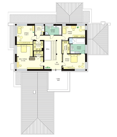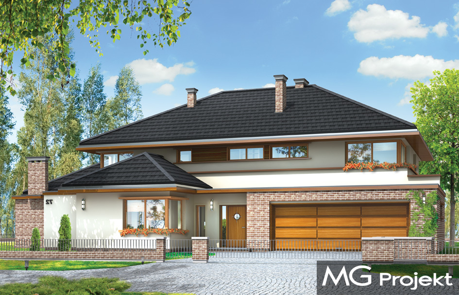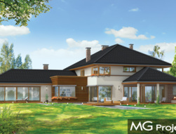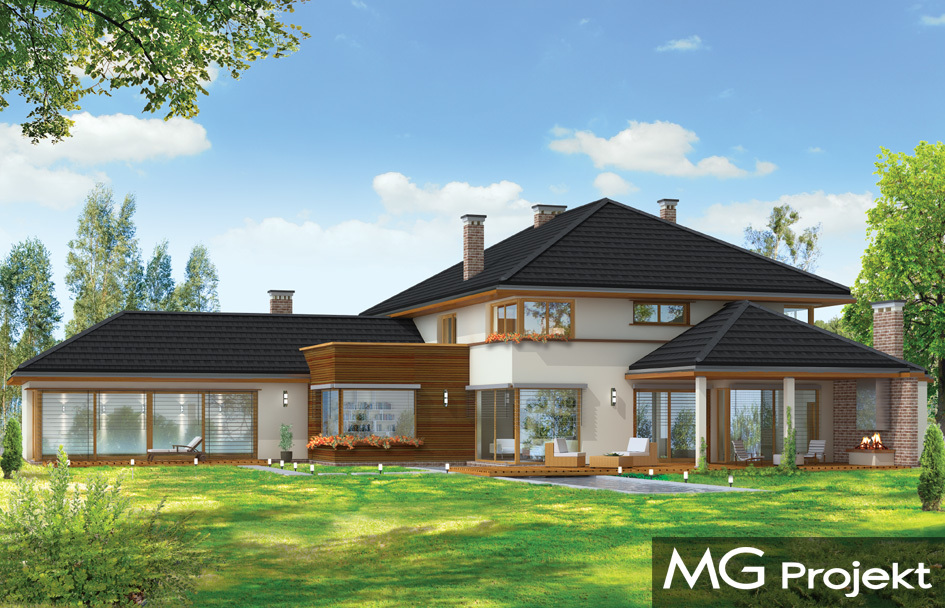 Willa z basenem to obszerna rezydencja dla rodziny cztero-sześcioosobowej. Dom składa się ze zwartej, jednopiętrowej bryły przekrytej czterospadowym dachem, oraz dobudowanych dwóch brył parterowych, przekrytych wielospadowymi dachami. Budynek jest podmiejską willą o nowoczesnej, ale spokojnej architekturze. Ciekawa stylistyka domu z dobudowanym garażem, dużym zadaszonym podcieniem, oraz osobnym pomieszczeniem z tyłu willi, pełniącym funkcję wypoczynkową. Bryła budynku została ciekawie ozdobiona klinkierowymi i drewnianymi okładzinami elewacji, oraz loggiami i podcieniem wejściowym. Masywny ozdobny komin kominka wewnętrznego i zewnętrznego, czy narożne okna - to dodatkowe ozdoby domu. Na parterze przez szerokie przeszklenia z salonu zaplanowano wyjście do dużego podcienia i na taras ogrodowy. W projekcie wszystkie elementy elewacji tworzą spójną, spokojną kompozycyjnie całość. Pracownia posiada także wersję projektu w odbiciu lustrzanym.